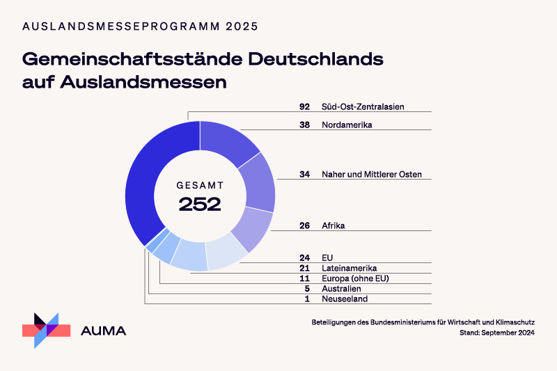 Die wichtigste Zielregion des Programms werden 2025 – wie in den vergangenen Jahren schon – die Märkte Asiens sein: Mehr als 90 Gemeinschaftsbeteiligungen deutscher Unternehmen werden dort unterstützt. Weitere Zielregion des Programms ist Nordamerika mit knapp 40 Beteiligungsmöglichkeiten, gefolgt vom Nahen und Mittleren Osten mit 34 und Afrika mit 26 Beteiligungen. 35 German Pavilions werden auf Messen in Europa geplant, darunter elf außerhalb der Europäischen Union. In Lateinamerika sind mehr als 20 Beteiligungen geplant, in Australien/Ozeanien sechs.