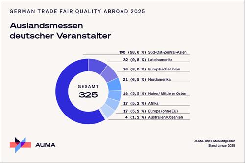 Im laufenden Jahr planen die deutschen Messegesellschaften 325 Messen in knapp 40 Ländern, deutlich mehr als noch in den beiden Jahren zuvor. Alle Termine sind jetzt in der AUMA-Messedatenbank zu finden.