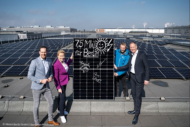 Auf dem Gelände der Messe Berlin hat Wirtschaftssenatorin Franziska Giffey Berlins größte Solar-Dachanlage eingeweiht – ein Gemeinschaftsprojekt der Messe Berlin und der Berliner Stadtwerke. Die Anlage erstreckt sich über 16 Hallendächer der Messe Berlin und umfasst Module mit einer installierten Gesamtleistung von fast 7,5 Megawatt (MW). Damit zählt sie zu den derzeit größten Solar-Dachanlagen Deutschlands.