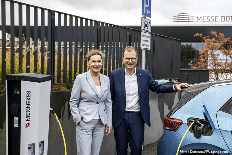 Sabine Loos, Hauptgeschäftsführerin der Westfalenhallen Unternehmensgruppe, erklärte bei einem Vor-Ort-Termin mit Christopher Mennekes, Geschäftsführender Gesellschafter der Mennekes Elektrotechnik: „Als Unternehmen sehe ich es als unsere Pflicht an, Verantwortung zu übernehmen. Und Verantwortung übernehmen heißt für mich an die Zukunft denken. Nachhaltig denken. Dabei kommen wir an dem Thema E-Mobilität nicht vorbei. Wir selbst sind dabei, unsere firmeneigene Fahrzeugflotte mehr und mehr auf E-Antriebe umzustellen. Umso mehr freut es uns, wenn auch unsere Gäste darauf setzen. Und wir sie dabei unterstützen können.“