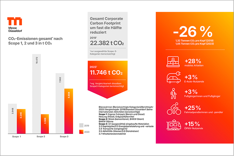 Eine der weltweit erfolgreichsten Messegesellschaften, die Messe Düsseldorf, hat ihren ersten freiwilligen Nachhaltigkeitsbericht für das Jahr 2023 veröffentlicht. Bezogen auf die Treibhausgasemissionen weist der Bericht in den betrachteten Kategorien eine deutliche Reduktion um 48 Prozent aus, die sich in den ersten vergleichenden Treibhausgasbilanzen für 2019 und 2023 zeigt.