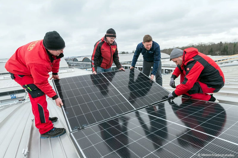 Bei der Messe Friedrichshafen hat der Bau der größten Photovoltaik-Anlage in der Bodenseeregion begonnen. Die ersten von insgesamt 12.350 PV-Modulen wurden auf der Halle A7 montiert. „Wir freuen uns, dass unsere Planungen nun in die Tat umgesetzt werden und wir voll im Zeitplan liegen. Die Inbetriebnahme der Photovoltaik-Anlage erfolgt sukzessive nach jeweiliger Hallenfertigstellung – Ende 2025 soll die Inbetriebnahme der Gesamtanlage folgen“, sagt Roman Bodenmüller, der als Geschäftsführer der neu gegründeten Messe Friedrichshafen Energie Projektgesellschaft mbH das Großprojekt federführend betreut.