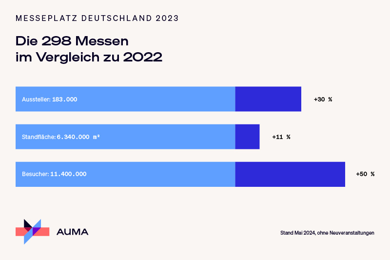Rund 183.000 Unternehmen stellten 2023 auf den rund 70 Messeplätzen in Deutschland aus. Das ergibt ein Plus von 30 Prozent gegenüber 2022. Alle Messen zogen rund 11,4 Millionen Besucherinnen und Besucher an, über 3,8 Millionen (+ 50 Prozent) mehr als 2022. Die Standfläche stieg von 5,7 auf 6,34 Millionen Quadratmeter (+ elf Prozent).