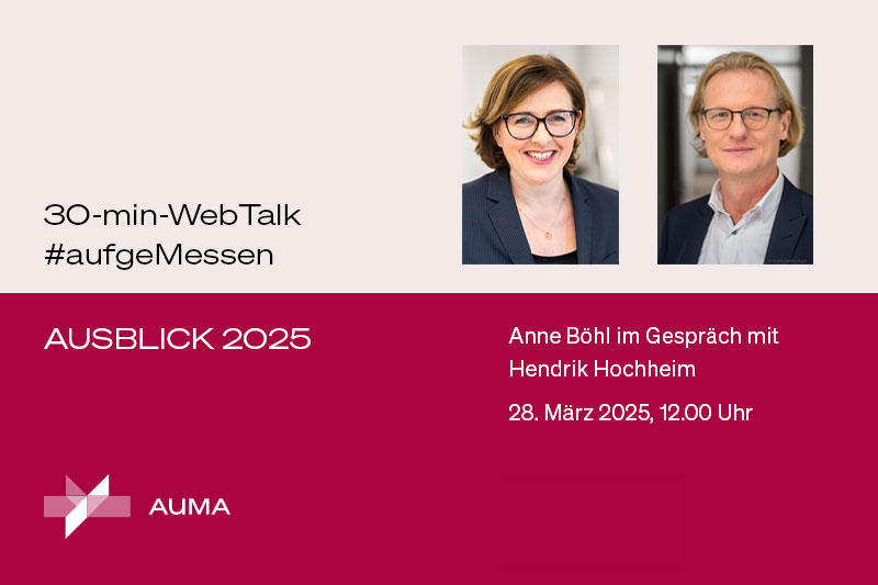 Trotz der anhaltenden Rezession in Deutschland halten rund 60 Prozent der ausstellenden Unternehmen ihre Messeaktivitäten stabil. Zugleich hält sich das Verhältnis von Rückgängen und Zuwächsen an Messebeteiligungen ausgewogen. Wie entwickeln sich die Messebudgets und was ändert sich an der Strategie ausstellender und veranstaltender Unternehmen? Was lässt sich aus dem sehr guten Messejahr 2024 in die Gegenwart mitnehmen? Diese und weitere Fragen beantwortet Ihnen Hendrik Hochheim, AUMA-Geschäftsbereichsleiter Messen Deutschland, in unserem nächsten Webtalk der Reihe #aufgeMessen.